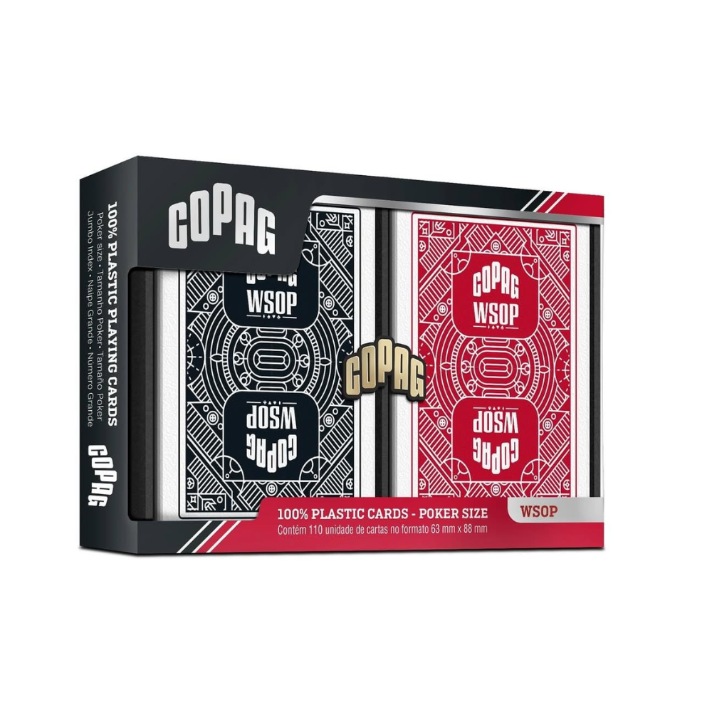 El set COPAG WSOP Poker incluye 2 mazos de cartas oficiales de la World Series of Poker, el torneo de póker más prestigioso del mundo. Fabricadas en 100% plástico, estas cartas ofrecen máxima durabilidad, resistencia al agua y un manejo profesional, tal como las que utilizan los grandes jugadores en las mesas de campeonato.